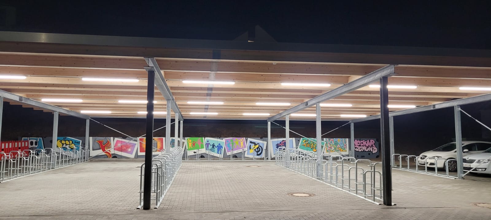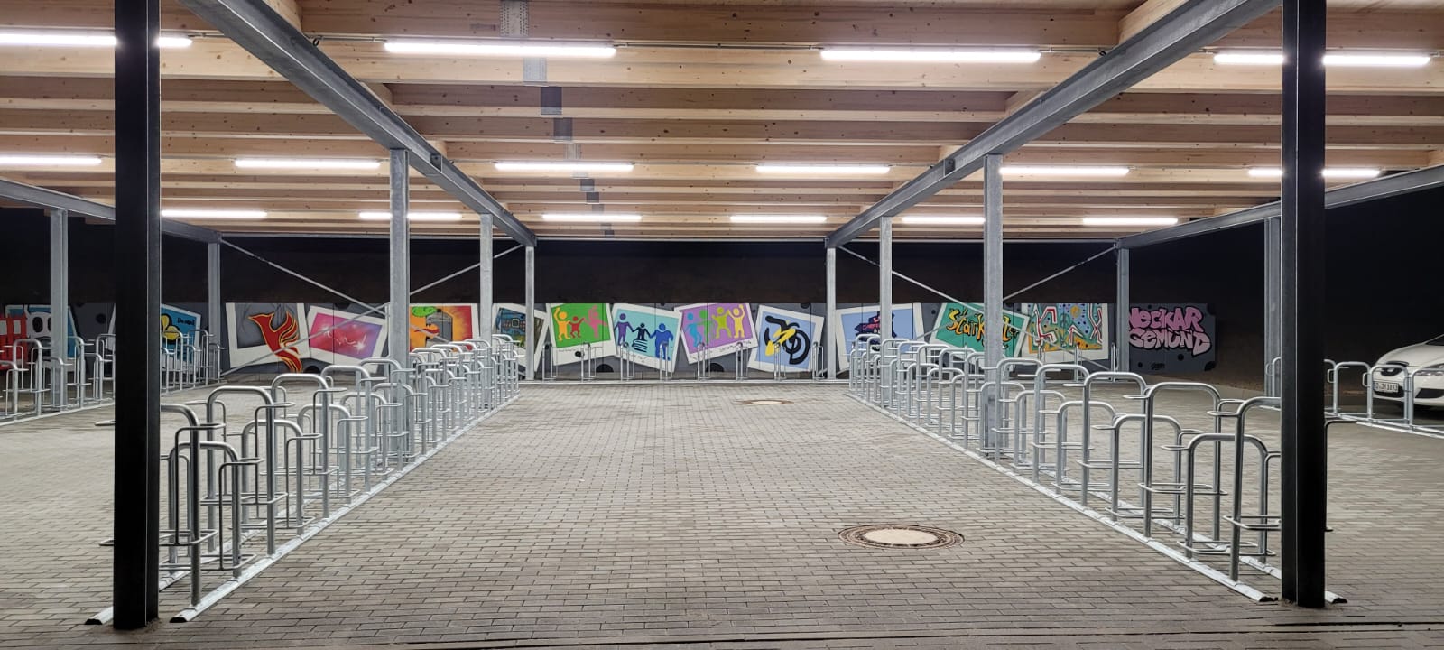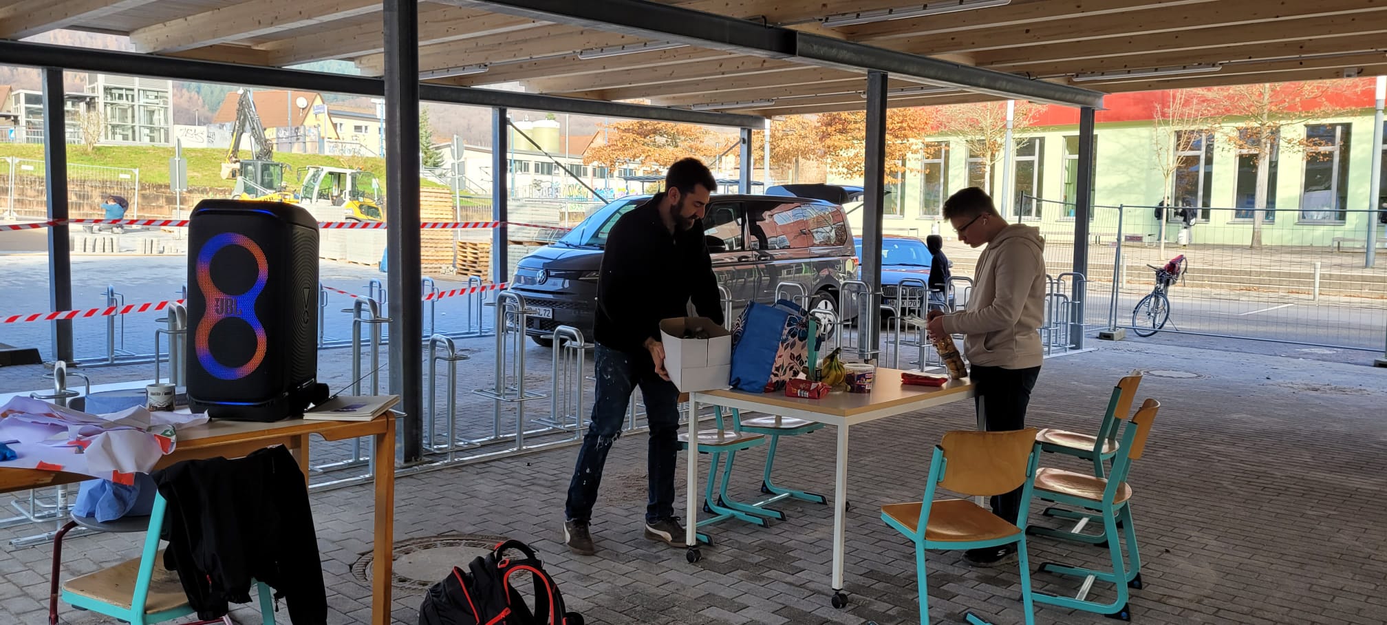 Schule vor Ort, in der Stadt, "Schule im Quartier - diese Möglichkeiten, am Ort zu wirken, versuchen wir zu nutzen (wie das Singen des Chores in der Johannes-Diakonioe). Die Stadt Neckargemünd bot über ihren rührigen Jugendreferenten, Herr Kuderna, einen Graffiti-Workshop an, der Sinn macht: die Rückwad des Platzes für die neuen Fahrradständer am Schulzentrum brauchte Farbe und so bot die Jugendarbeit der Stadt Neckargemünd gemeinsam mit dem bekannten Heidelberger Graffiti-Künstler Florian Feigenbutz einen kostenlosen Graffiti-Workshop mit Sprühdosen an. Unter fachkundiger Anleitung lernten die Teilnehmenden,unsre Streetart-AG, wie aus einer grauen Fläche echte Urban Art entstehen kann. Stella Cadoni, Viktoria Heid, Samantha Schmich und Lisa Marie Ebinger waren mit Feuereifer dabei, lernten viel über die Gestaltung von Flächen in Städten hinzu und hatten einen tollen Austausch mit Herrn Kuderna und Herrn Feigenbutz.