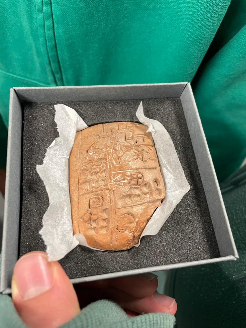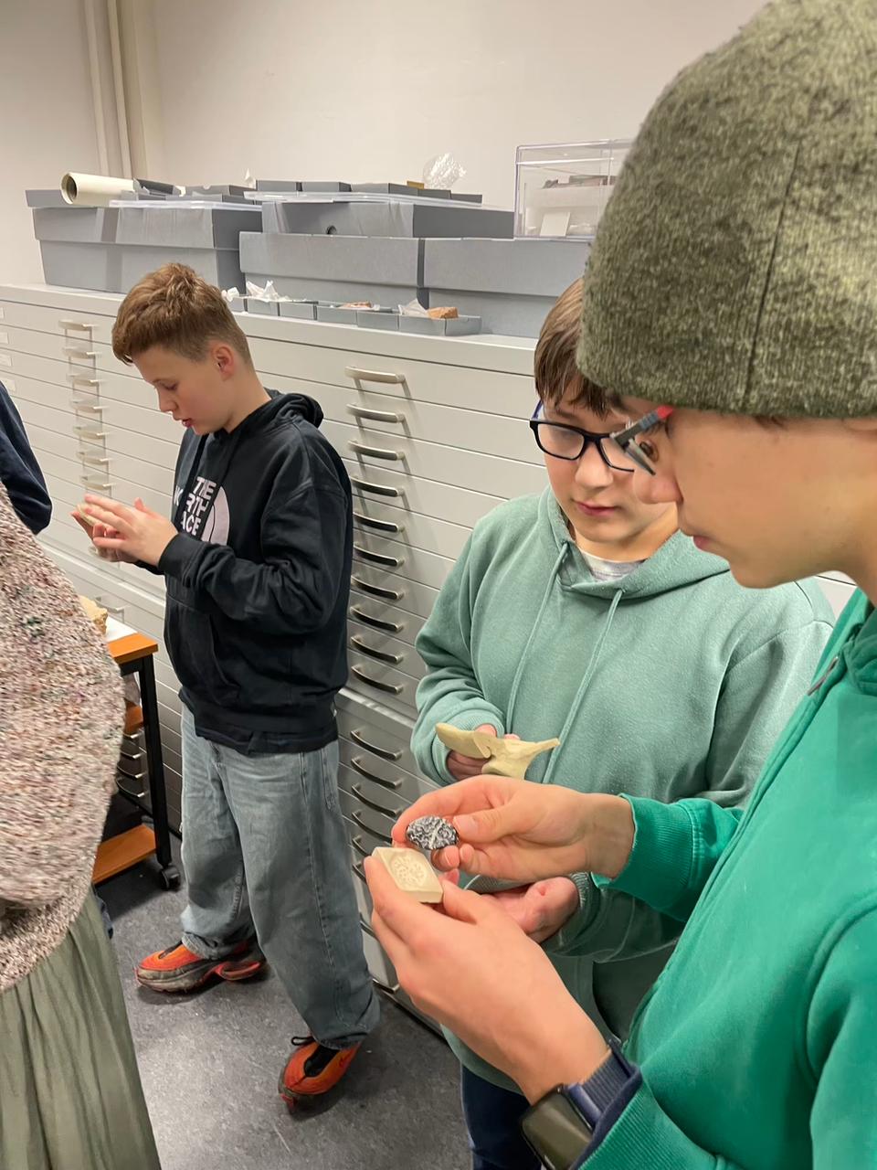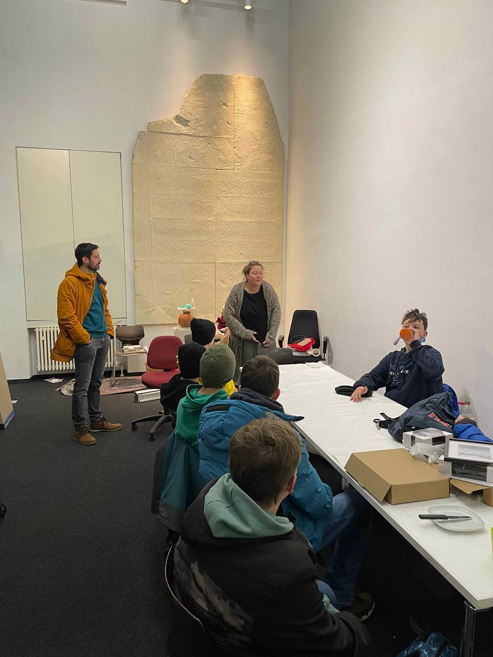 Im Anschluss bekamen wir eine kleine Führung durch das Institut für Archäologie. Dabei konnten wir beeindruckende Funde bestaunen – darunter alte Schätze aus dem Iran. Ein besonderes Highlight war, dass die Schülerinnen und Schüler echte Schrifttafeln mit den ersten bekannten Handschriften der Menschheitsgeschichte, über 6.000 Jahre alt, selbst in die Hand nehmen durften. Außerdem konnten wir historische Gefäße sowie alte Nägel und Münzen aus nächster Nähe betrachten.