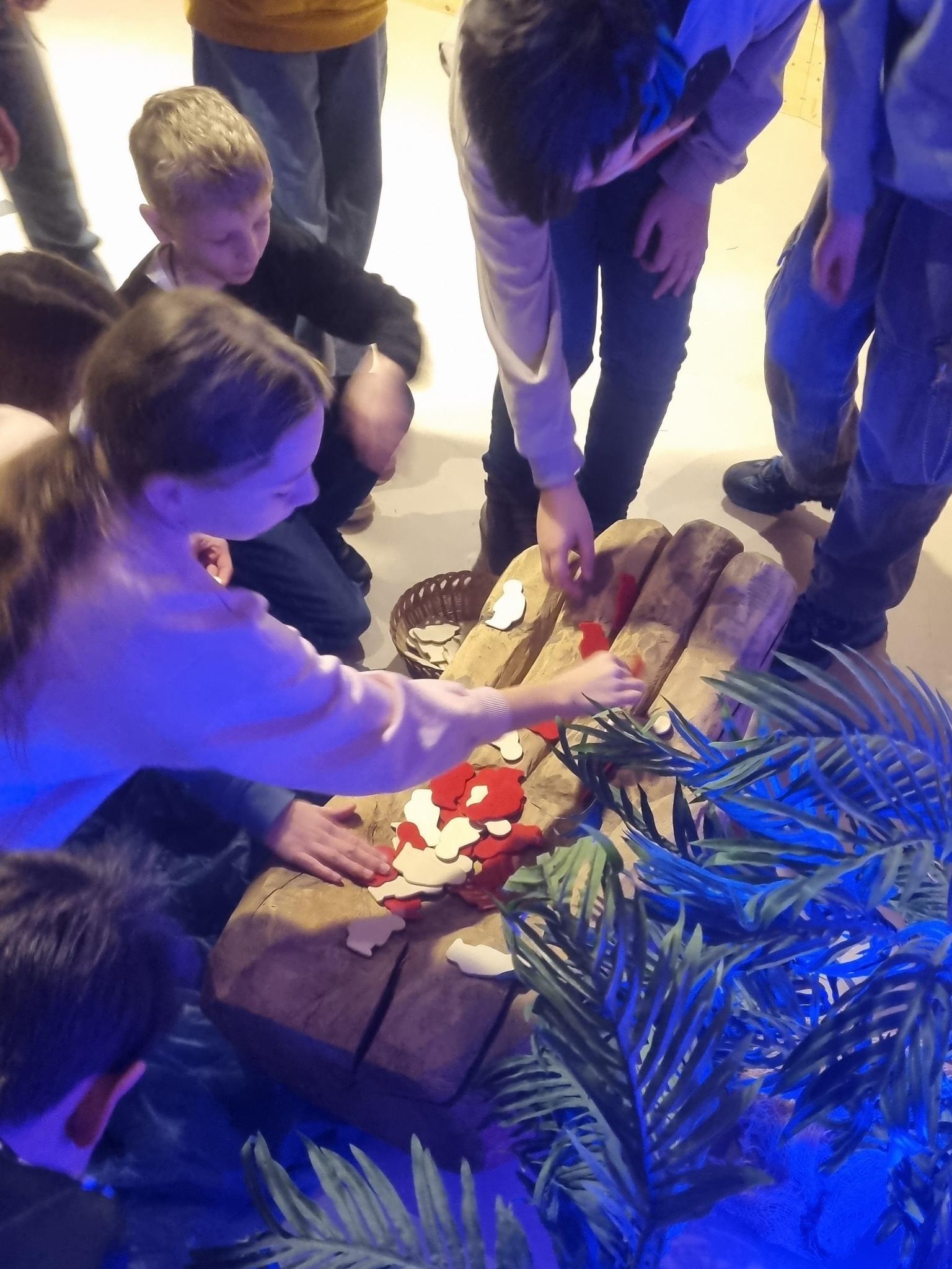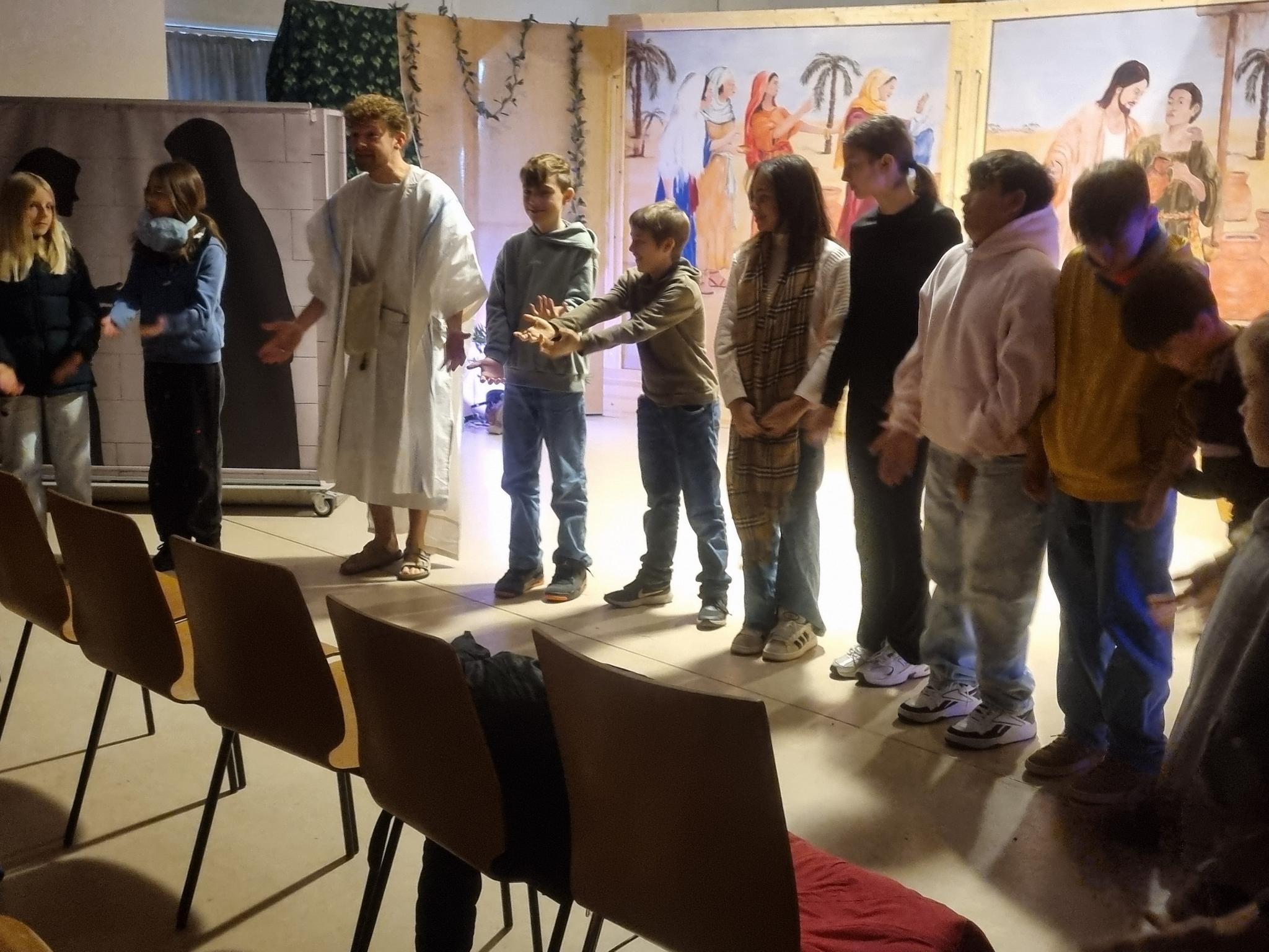 Jesus begegnen Menschen: Wer ist eigentlich dieser Jesus, dessen Geburt alle an Weihnachten feiern? Scheint ja jemand sehr besonderes zu sein… Die Schüler wurden mit auf eine Zeitreise genommen und konntn erleben, wie er ganz verschiedenen Menschen begegnet. In den Räumen der Ev. Hosanna-Gemeinde Heidelberg war ein „Sinnenpark“ aufgebaut: Raumhohe, sich verändernde Kulissen, Klangwelten, Requisiten und ein Bewohner aus Nazareth ermöglichten es den drei Religionsklassen von Frau Hügel, Frau Meißner und Herrn Wiesner, die Geschichte von Jesus mit allen Sinnen zu erleben.