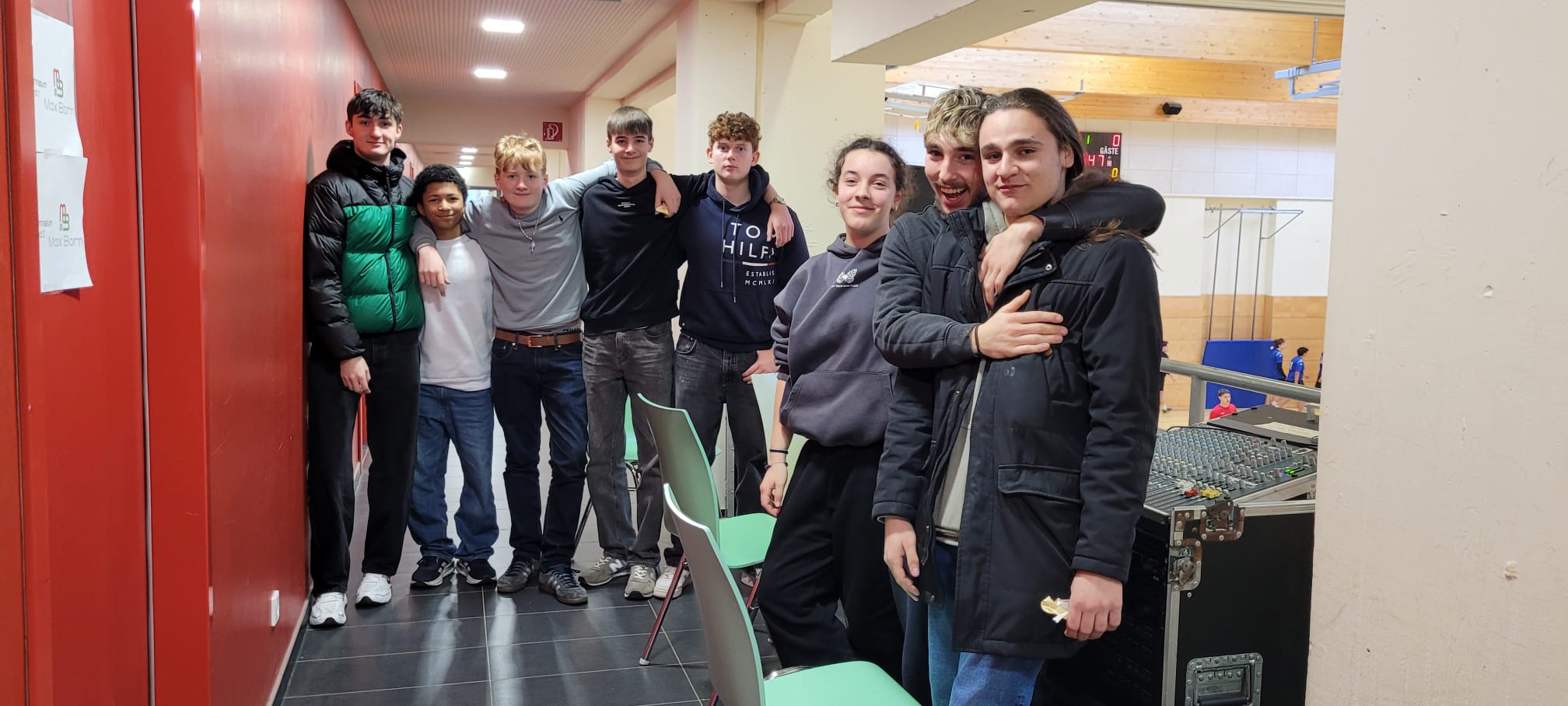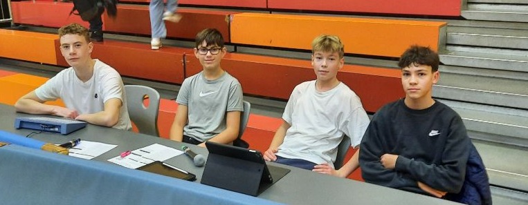 Es war ein großes Turnier mit neun gemeldeten Mannschaften aus den 9. und 10. Klassen. Von Östringen, über Brühl bis Eberbach reisten die einzelnen Teams an und verliehen der Veranstaltung fast "internationalen Fair" ;-). Die vier Schüler führten durch das Turnier, hatten den Spielplan entworfen, übernahmen das Mikrofon, hatten eine Playlist organisiert, das Technik-Team damit integriert und informierten über die elektronische Spielstandstafel über die Zwischen- und Endergebnisse.