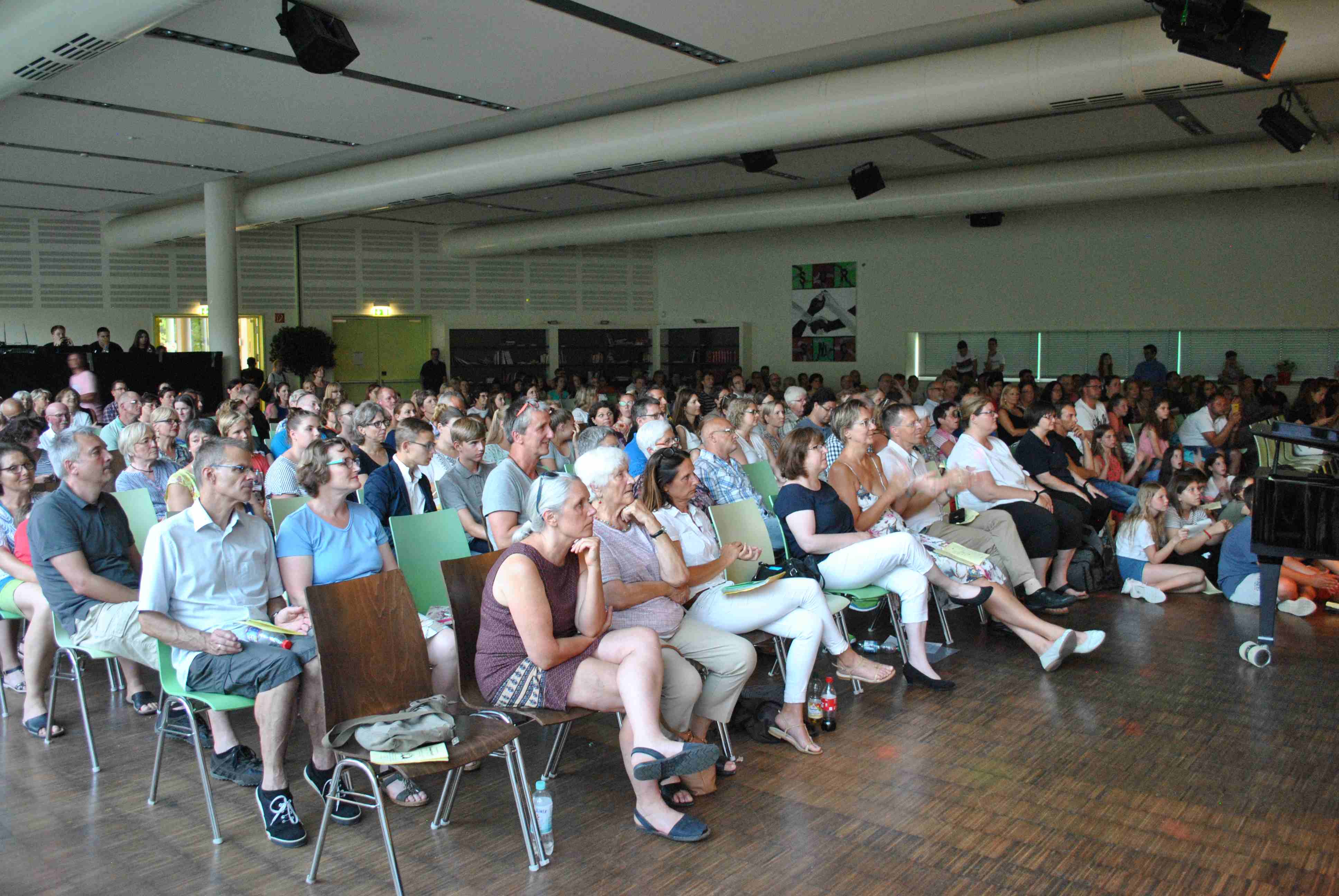 Freundschaft & Gemeinschaft - dies war das Motto des diesjährigen Sommerkonzerts am Donnerstag, 27. Juni 2019 - mit Solisten von Saxophon bis Gesang, Unter- & Oberstufenchor, dem Chor der 5. Klassen, den beiden Schulbands, einer musizierenden Klasse und der Tanz-AG. In diesemJ ahr wurden die Musiker von der Fachschaft BK mit digitalen und "Live-Bildern" vor Ort unterstützt. Die Originale sind noch bis 27. September im Rathaus der Stadt zu sehen. Mit dem großen Chor startete um 19 Uhr ein musikalischer Genuss in der Aula des Schulzentrums und trotz der Hitze waren zahlreiche Gäste unserer Einladung gefolgt. Die Stimmung sprang sofort auf das große Publikum über und die Darbietungen bereiteten allen einen harmonischen und fröhlichen Abend an unserer Schule. Organisation und Bewirtung lag in den Händen der Musikfachschaft mit Annette Ziegler, Claudia Hügel und Michael Scheffler. An dieser Stelle sei den unterstützenden Eltern, Schülern und Herrn Vogt als Klassenlehrer der 5a gedankt, die ein tolles Buffet und einen kühlenden Getränkeverkauf realisierten.